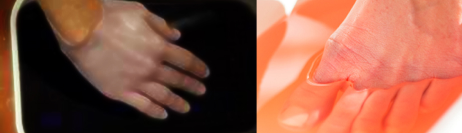 Hands are soaked in melted paraffin wax to soften and moisturize dry hands and nails.
